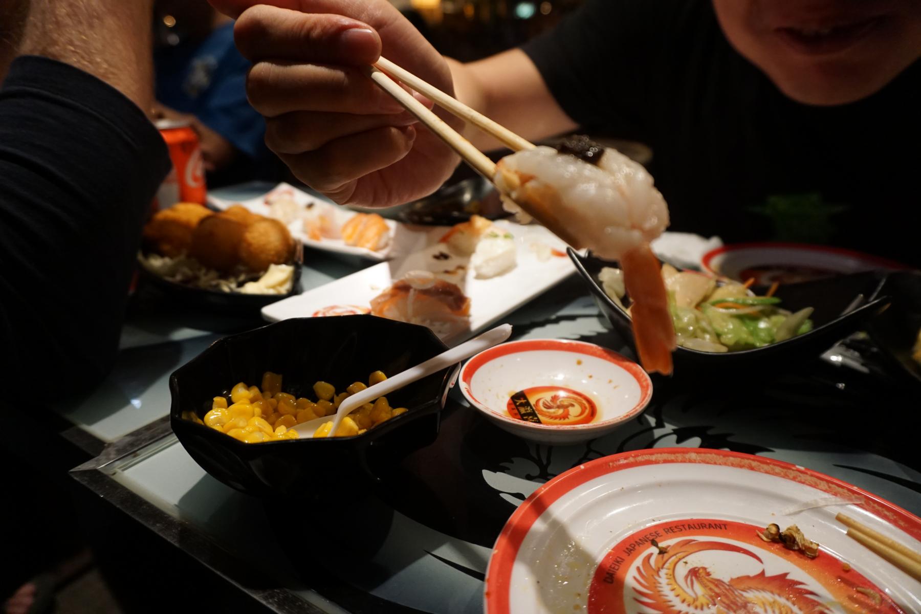 Also man muß hier für all you can eat einen Tisch vorbestellen, egal ob Wochentags oder am Wochenende. Dann gilt es wirklich zu dieser Zeit am Eingang zu sein und manchmal muss man noch kurz warten. Wir dachten, wir warten vor einer Abflughalle, an der viele Passagiere gestrandet sind, doch weit gefehlt es war das Restaurant der Begierde. Wir wurden also nach wenigen Minuten an unseren Platz geleitet. Es war dunkel, laut und eng. Und dann läuft die Zeit: 2 Stunden, solange kann man bestellen und essen, danach heißt es raus, damit Platz für die Nächsten ist.